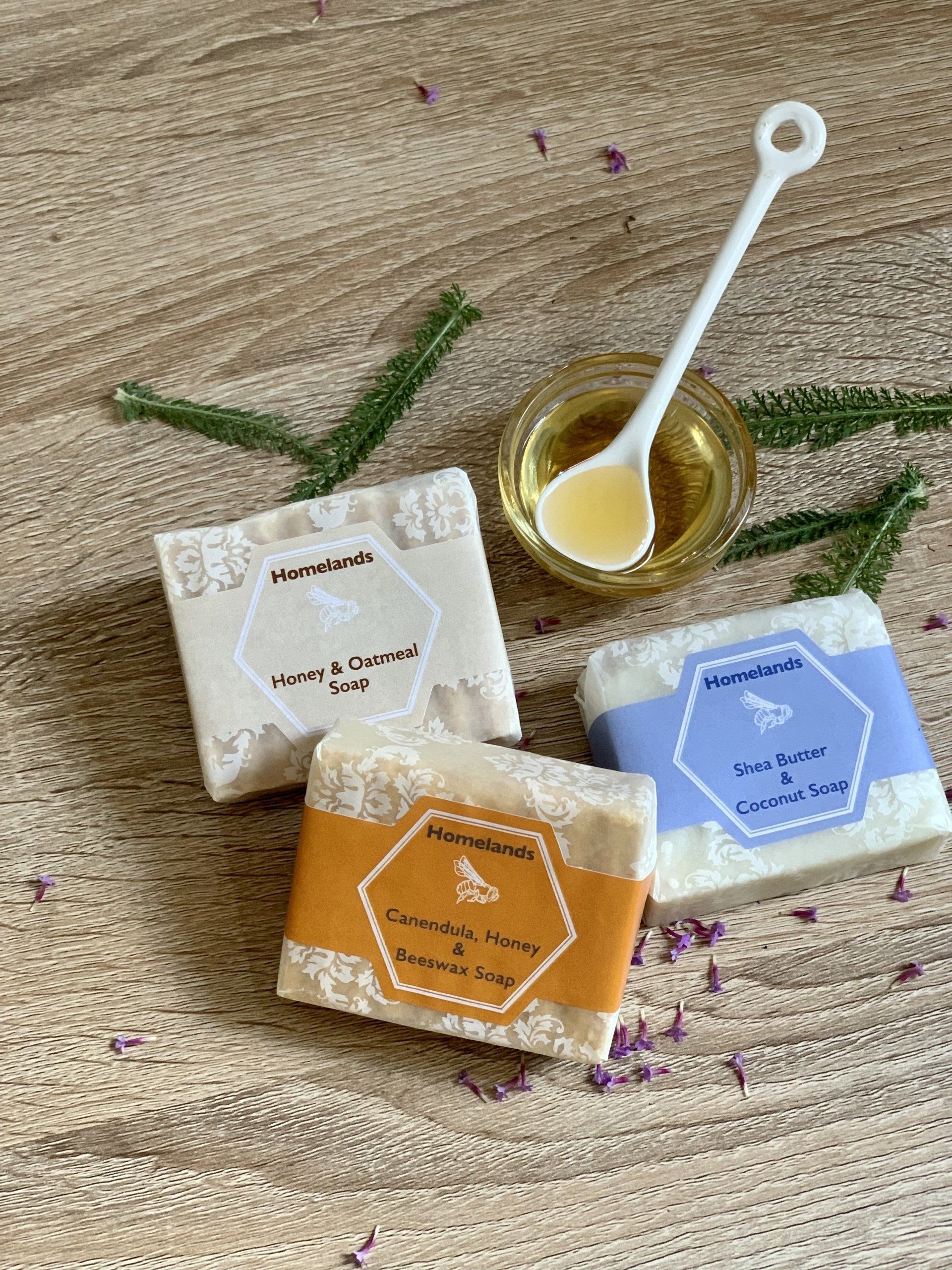 All our honey and beeswax soaps are handmade by us using the traditional cold process method. This is a method that has been used for thousands of years and is made by mixing an alkali ( also known as lye ) with water, then blending it with natural oils, honey, beeswax and fragrance oils. It then remains in the mould for twenty four hours to saponify (become soap ).